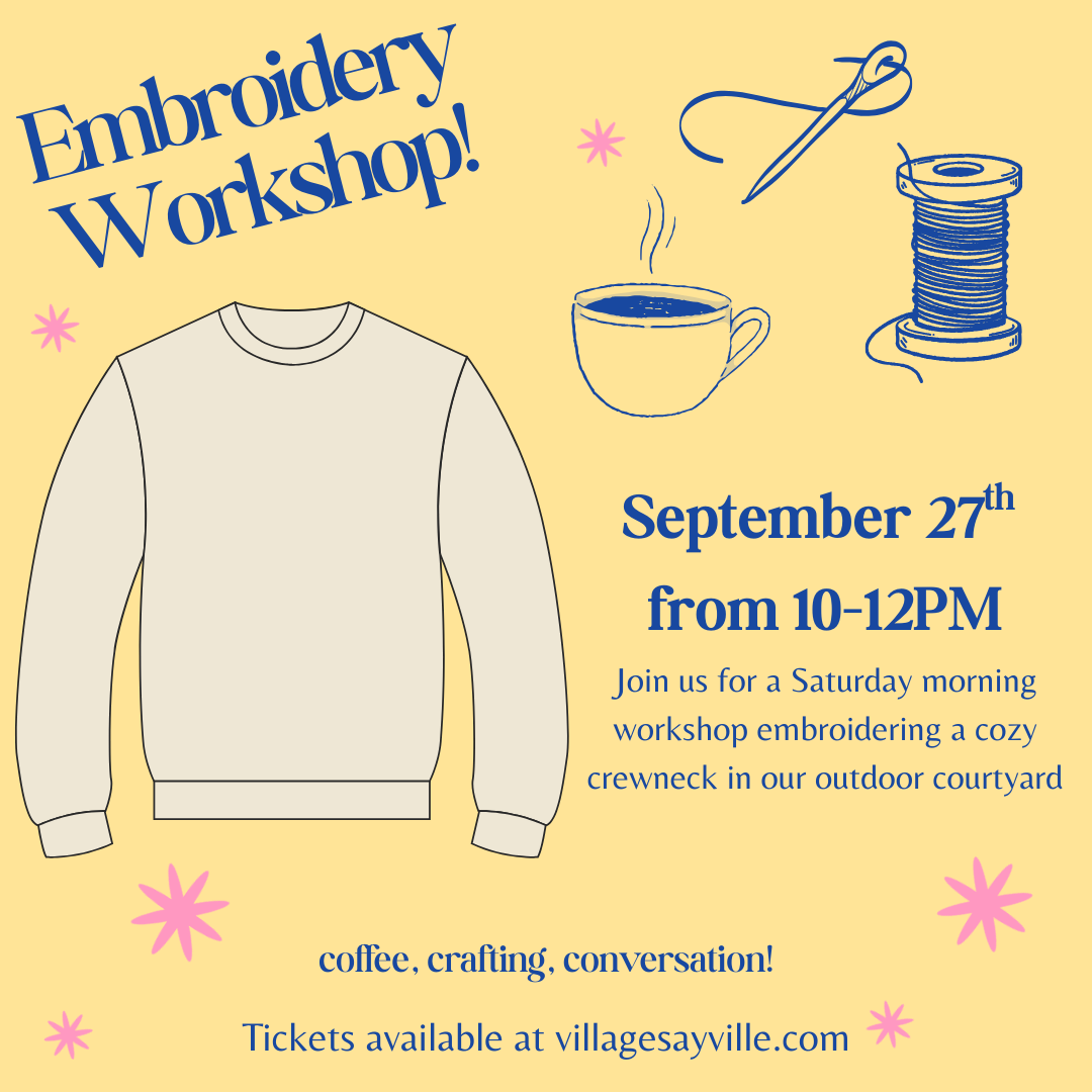 Join us for a cozy crewneck sweatshirt Embroidery Workshop in our outdoor courtyard!